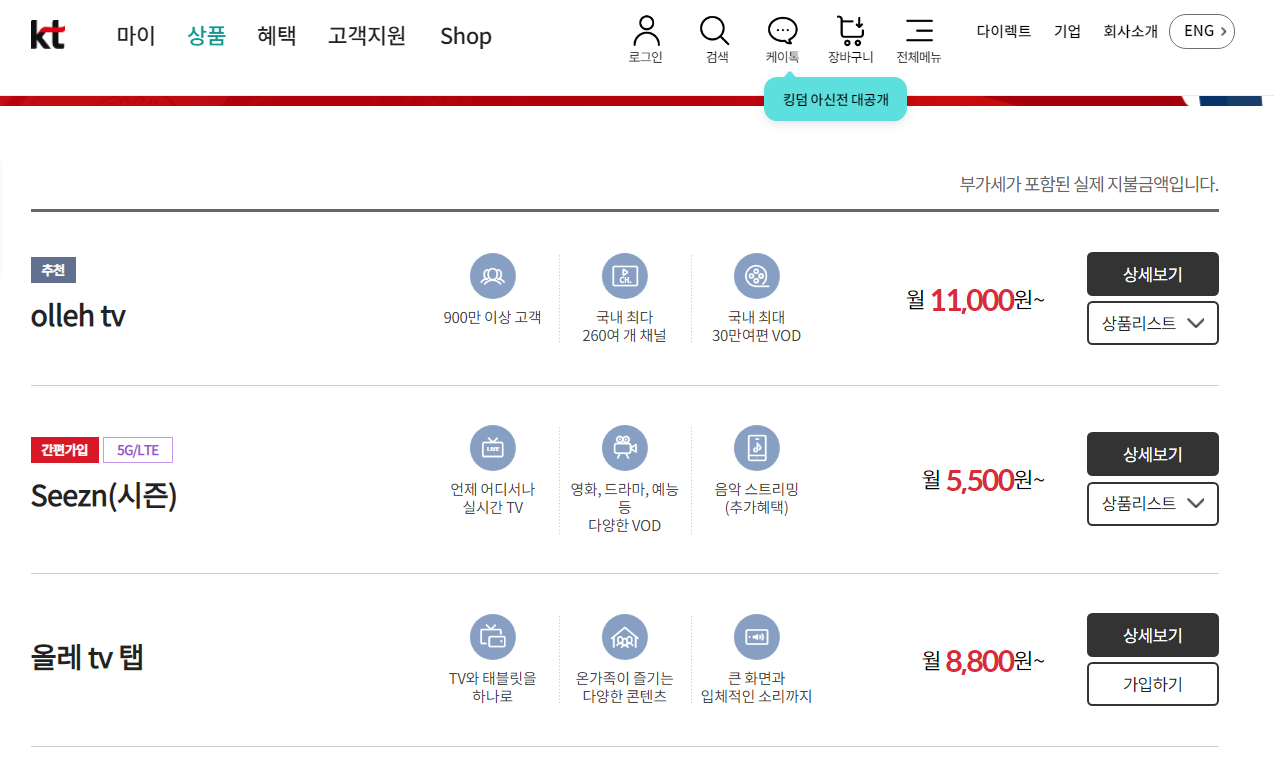 필자는 기존 인터넷, TV, 와이파이, 기가지니 상품을 사용 중이였으나