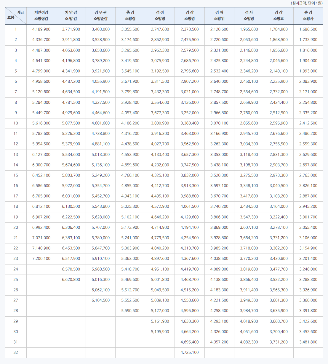2022년 경찰 공무원, 소방 공무원 및 의무경찰  봉급표